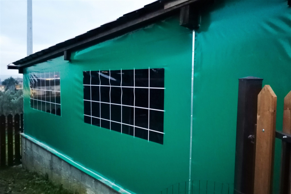 Fornitura e montaggio di teli in PVC ad uso laterali scorrevoli con finestrature in PVC Cristal trasparente.